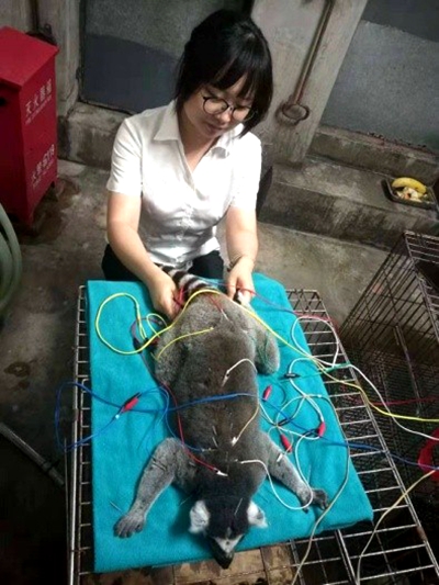 第四次治疗(9月17日):食欲恢复至正常的70%,没有那么挑剔,也会取食少量油麦菜和水果,后肢力量已恢复90%以上,有跳跃的能力,但前肢力量较差。由于频繁的跳跃和攻击行为,针灸难度加大,为了避免损伤及应激,暂停针刺,只用灸法,依旧使用随身灸,日一次,一次1小时左右。并且从今天开始进行每日康复训练,好吃的食物,置于笼子顶端,需完全站立,手臂上举才能够到。