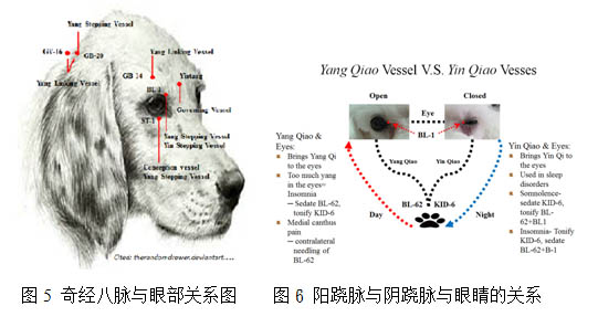 这种结合脏腑之间功能失调与否而诊断的方法,有助于眼睛疾病之治疗。奇经八脉,包括督脉、任脉、阴跷脉、阳跷脉、与阴维脉与阳维脉,也与目系或目本相互连结,扮演了眼睛阴阳之气调节的重要角色 (图5与6)。内外病邪,除会造成身体疾病外,也会将问题与症状表现在眼睛。透过这些症状与其特定经络和脏腑的关系,并确认其失调的中医证型,临床兽医师可以有效的利用中兽医治疗眼睛疾病。