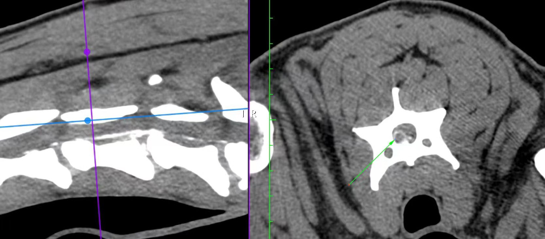 患犬2023年2月底洗澡后倒地不起,前肢关节肿胀,不吃不喝,CT检查发现椎间盘突出导致瘫痪。