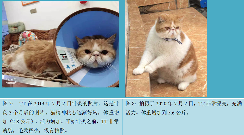 (3)TT体重逐渐增加。图7是TT在2019年7月2日针灸时的图片(针灸3个月后),此时TT的体重是2.8kg. 针灸之前,没有拍照,那个时候的体重是1.9kg. 图8是2020年7月2日的照片,猫的体重增加到5.6kg, 主人说TT现在越来越漂亮,而且精力旺盛。